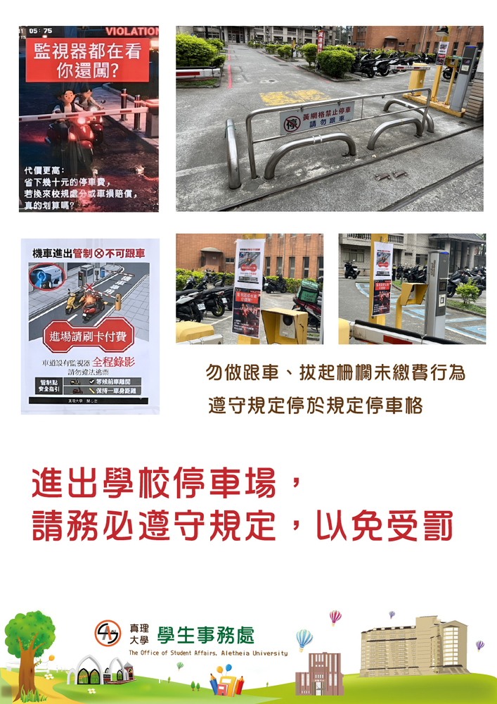 近日,學校新民街機車停場委外廠商調閱監視器時,發現跟車、拔起柵欄等相關違規事件。廠商準備提起告訴,以遏止此歪風。 為了維護校園安全及全校學生的權益,謹此告知,停放機車時,務必遵守規定,以免受罰。